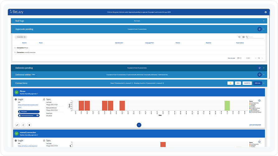Stop jumping from one platform to another! BeLazy gets all the task sources (content and translation management systems, emails, vendor portals, customer portals and more) into a unified dashboard. Now your team can keep an eye on everything that matters: projects, workload tracking, exceptions, vendor issues and more!